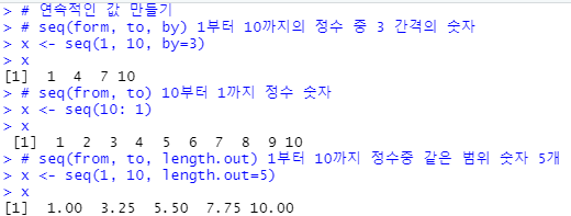 by의 경우 그 수 만큼 더하여 연속적인 수를 나타내고, length.out는 범위 안 생성할 벡터의 개수로 사이의 값을 정확히 나누어 생성한다.