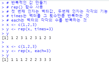즉 times=3 을 대입한경우 벡터값 1, 2, 3 이 총 3번 반복되는 것이 확인되고, each=3을 대입한경우 1이 3번, 2가 3번, 3이 3번 반복되는 것이 확인된다.