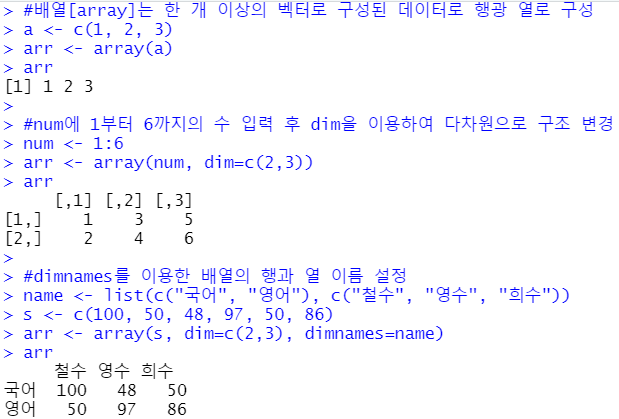 다차원 구조로 배열을 선언하여 한 눈에 보기 쉽게 행과 열의 이름을 설정하는 방법도 있는데, 위와 같이 name이라는 새로운 변수에 리스트로 행과 열과 맞게 이름을 설정하여 dimnames를 통해 설정이 가능하다.