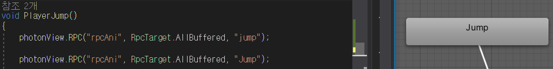 위와 같이 PlayerJump()의 첫 번째 줄의 파라미터 값 "jump"는 오른쪽의 애니메이션 이름 "Jump" 가 아니기에 오류가 났으며, 이후 두 번째 줄과 같이 파라미터 값을 "Jump"값 으로 바꾸어 실행해 오류를 해결하였다.