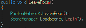 이동 함수 SceneManager.LoadScene()를 public override void OnLeftRoom() 에 사용.